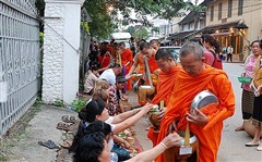 清晨于晨雾中参加琅勃拉邦著名的【僧侣化斋】(40-60分钟)仪式:(小乘佛教国家特有文化习俗)亲自对数千名僧侣进行布施,体验老挝人民对于宗教的虔诚与执着,在导游的带领下,走入琅勃拉邦古城中心区的【早间市场】(1-2小时),在近距离融入老挝民众生活的同时,您还能够在早市上发现不少的新鲜玩意。餐后前往琅勃拉邦著名的【皇宫博物馆】(30-60分钟)参 观:亲临老挝西萨旺冯国王的皇宫,体会老挝式建筑与法式建筑的完美融合,参观国王的议政厅、起居室、餐厅、娱乐室等,重点参拜琅勃拉邦名称的拉邦佛(由高 棉国王赠送的一尊金佛,尤为宝贵)。之后跟随导游在琅勃拉邦古城的小巷子中徜徉,尽情享受老挝悠闲、慵懒的生活节奏,前往【香通寺】(30-60分钟)参观:香通寺是琅勃拉邦城内最古老的佛寺之一,五彩斑斓的生命之树,老国王的金马车,低矮层叠的特色屋檐、造型各异的描金壁画都是香通寺最值得细细品味的地方。下午前往【大象营】,与大象进行亲密接触,更可以自费参与一次令人难以望怀的骑象之旅 自费体验森林骑象活动,返回市区后登临普西山。