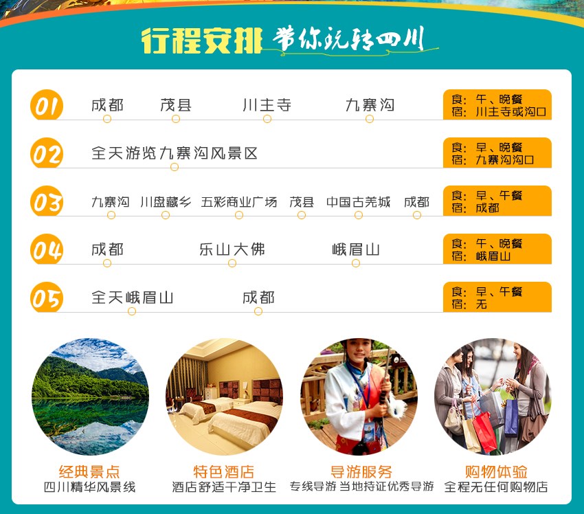 3.餐饮:4早8正,十人一桌,八菜一汤。早餐均在所住宾馆用餐,不含所有成都市区正餐。(因九寨沟餐饮条件有限,如不满意之处,请谅解)