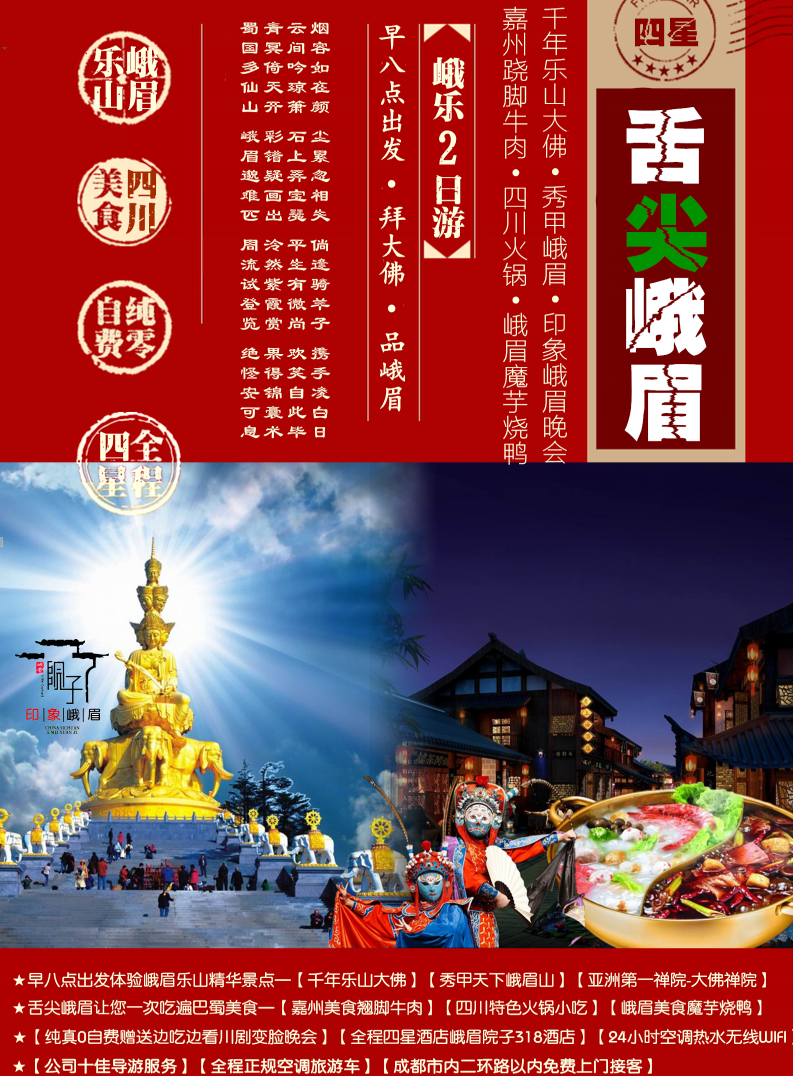 1、此行程为我社纯玩行程,行程内除了有新赠景点以外我社导游不安排任何购物项目。(乐山、峨眉山是佛教圣地景区内有很多宗教场所和贩卖当地特产的小贩,游客在景区以内参加的宗教活动和自行购买的商品我社不承担任何责任)。