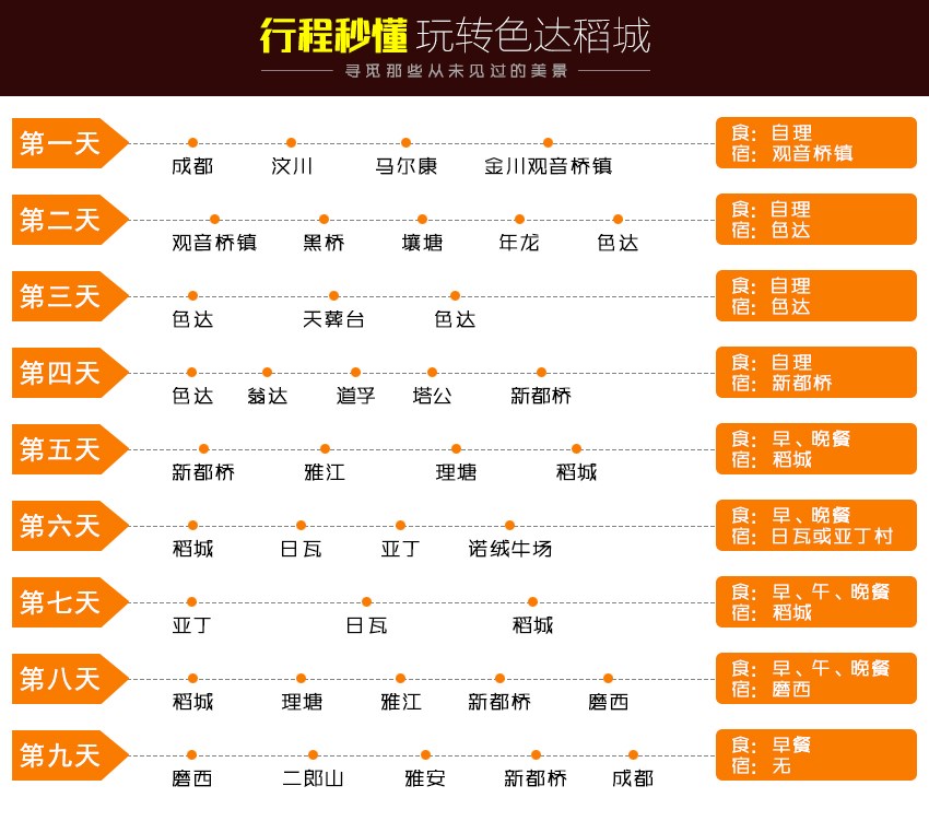 1、出团和散团:出团前一天晚上19—21点左右导游或司机通知出发时间,统一在营门口路107号(原白芙蓉宾馆门口)集合出发,集合时间:06:30左右(具体以稻亚通知为准),完团当天统一在西2.5环恩威集团统一散团;