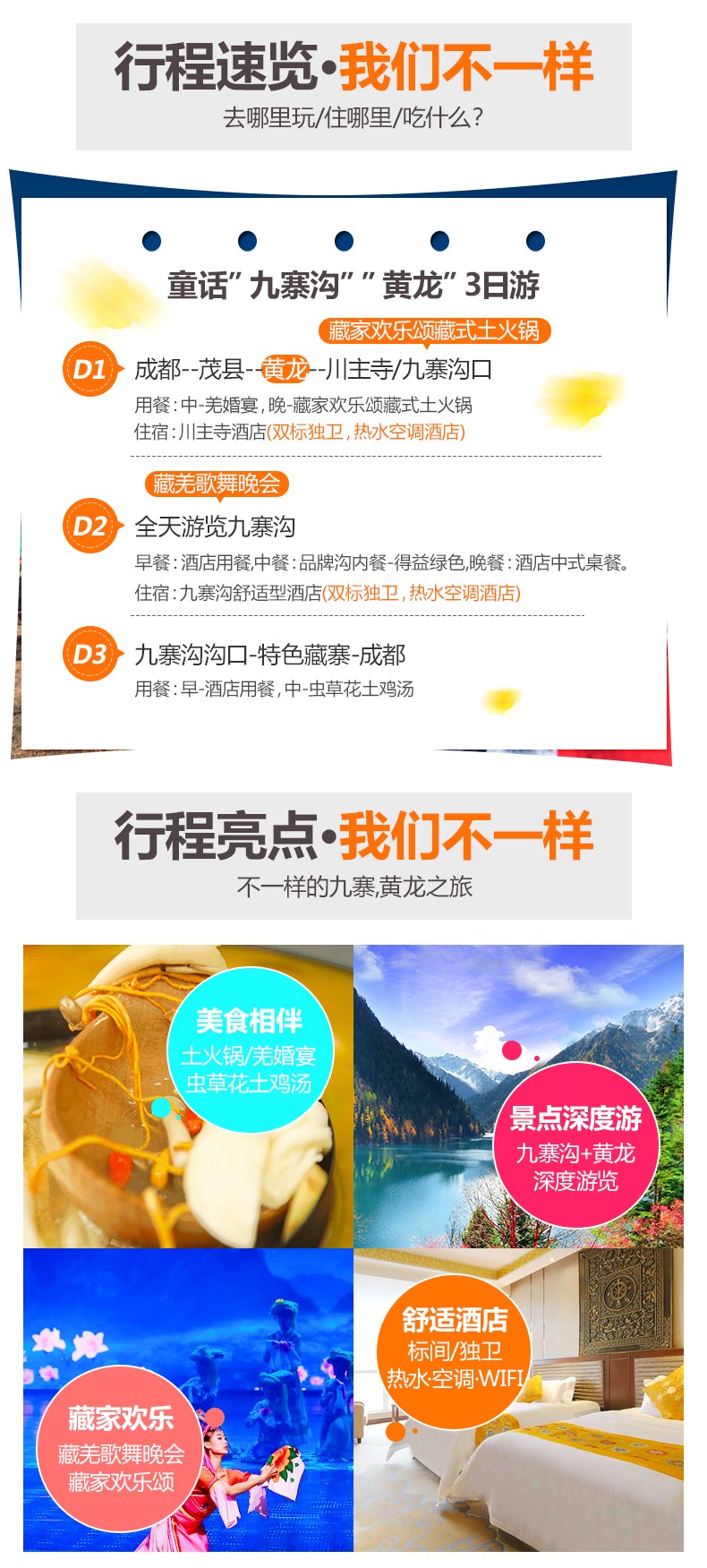 3.九寨沟属藏区,沿线提倡绿色环保,酒店不提供一次性洗漱用品,请游客自备。