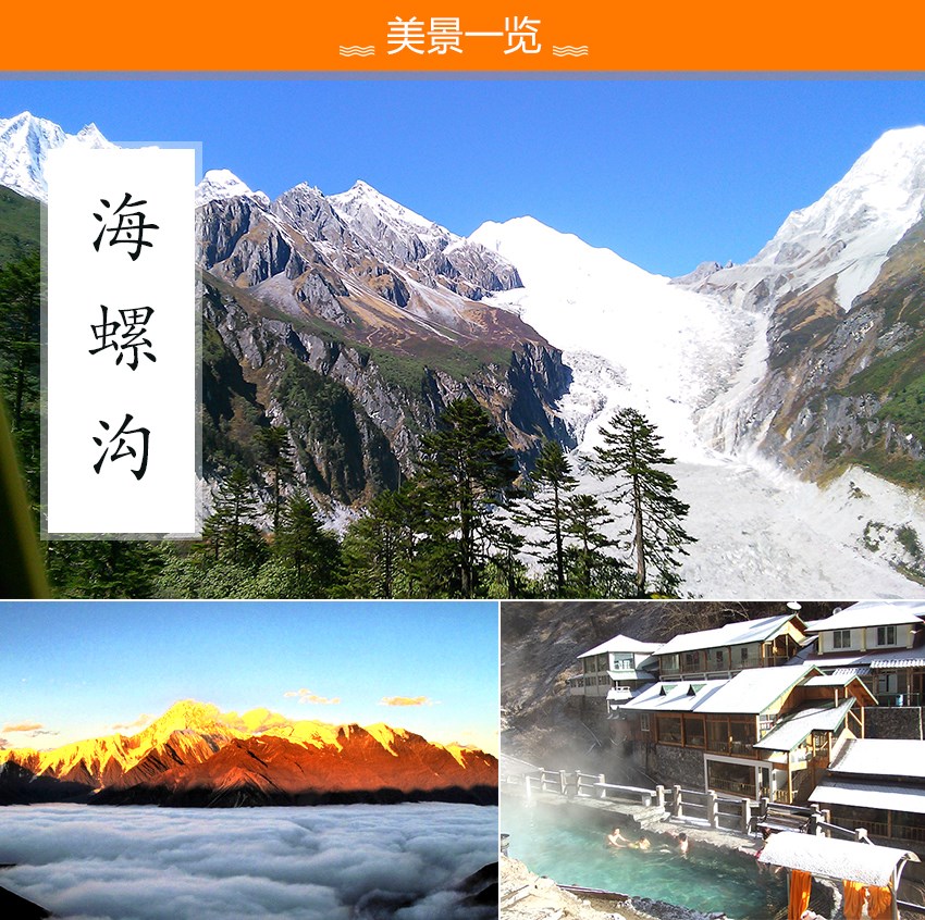 【门票】:双桥沟、海螺沟、燕子沟(学生、老年人、军人、记者、伤残人士、离休干部等凭有效证件可享受优惠,优惠金额由导游团上退还游客,因九寨沟为网上订票,故在统计时须告知导游,如未告知导游真实优惠票的情况而引起损失,由客人自理)