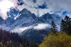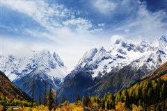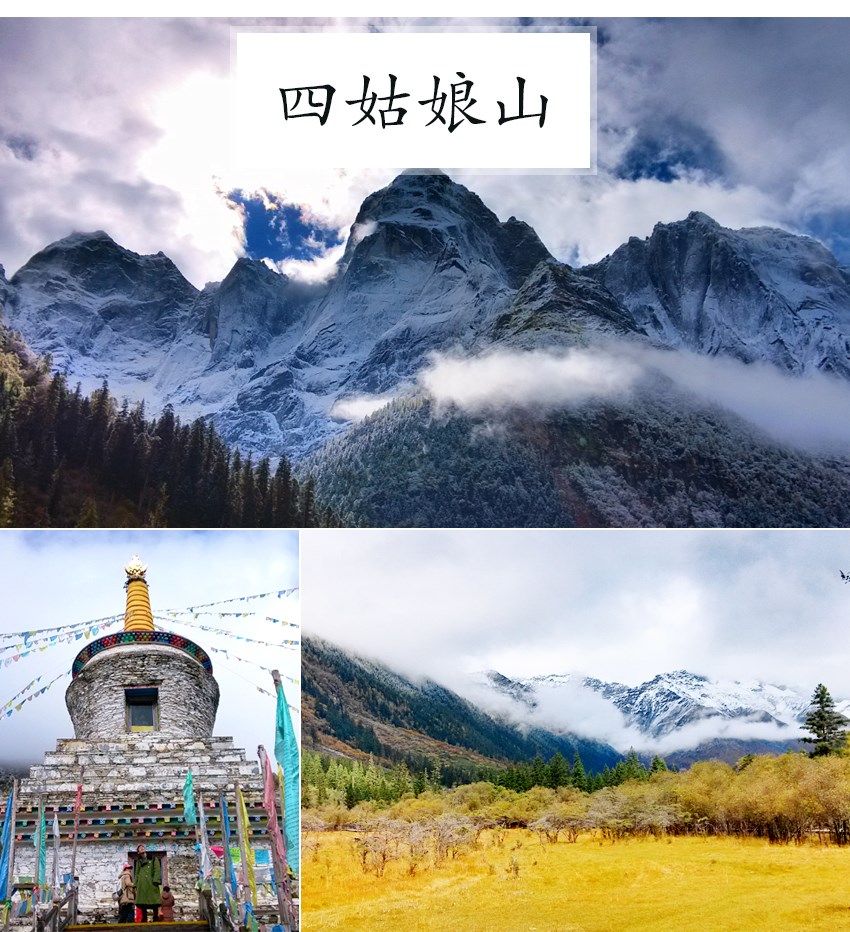 四姑娘山:以雄峻挺拔闻名,山体陡峭,直指蓝天,冰雪覆盖,银光照人。山麓森林茂密,绿草如茵,清澈的溪流潺潺不绝,宛如一派秀美的南欧风光,人称“东方的阿尔卑斯”