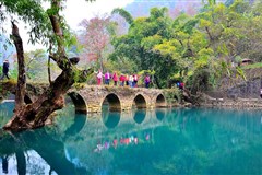 【小七孔桥】它位于贵州荔波县西南部,距县城28公里,至麻尾火车站36公里。景区北首有一座建于道光15(1836)年的小七孔古桥,景区之名由是得之。宽仅1公里、长12公里的狭长幽谷里,集洞、林、湖、瀑、石、水多种景观于一体,玲珑秀丽,令游客耳目常新,有“超级盆景”的美誉。被联合国教科文组织誉为“地球上同纬度的最后一颗绿宝石”。(20分钟)