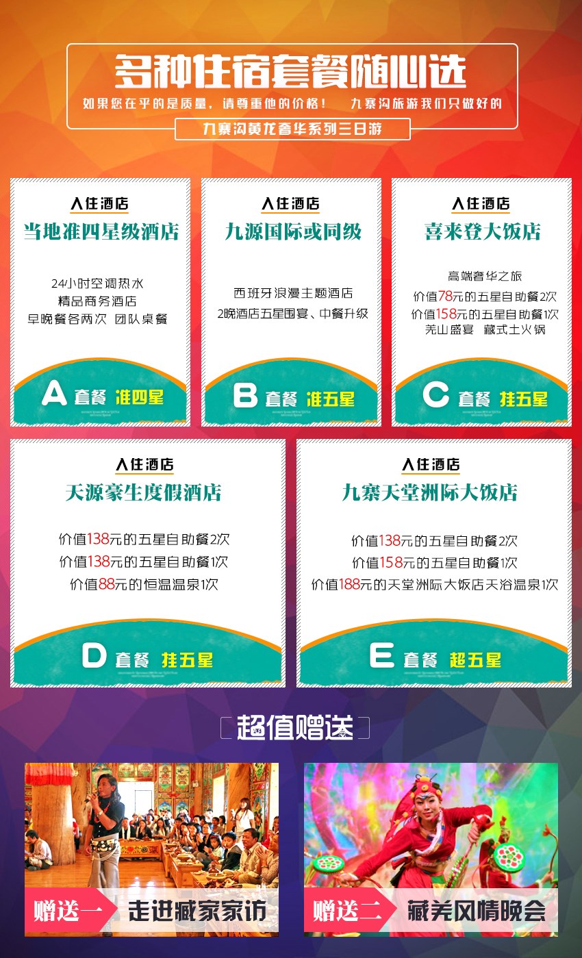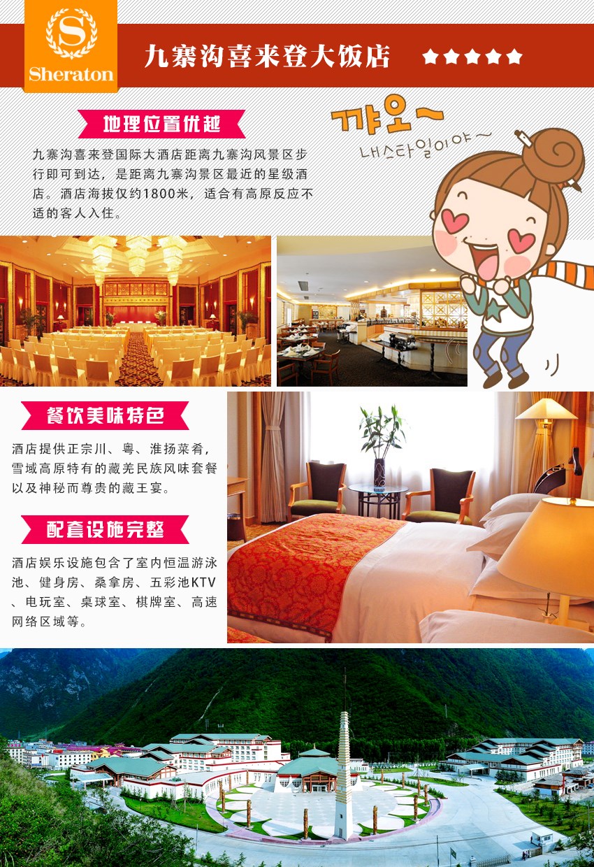 套餐三升级挂五星(九寨沟喜来登酒店):住宿挂五星酒店 赠送两早一晚酒店自助餐 赠送烤羊家访、藏羌风情晚会、升级特色餐饮。