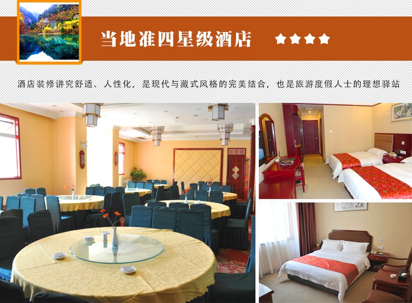 套餐一 豪华精品游准四:住宿当地准四24小时热水空调酒店,赠送烤羊家访、藏羌风情晚会、升级特色餐饮。
