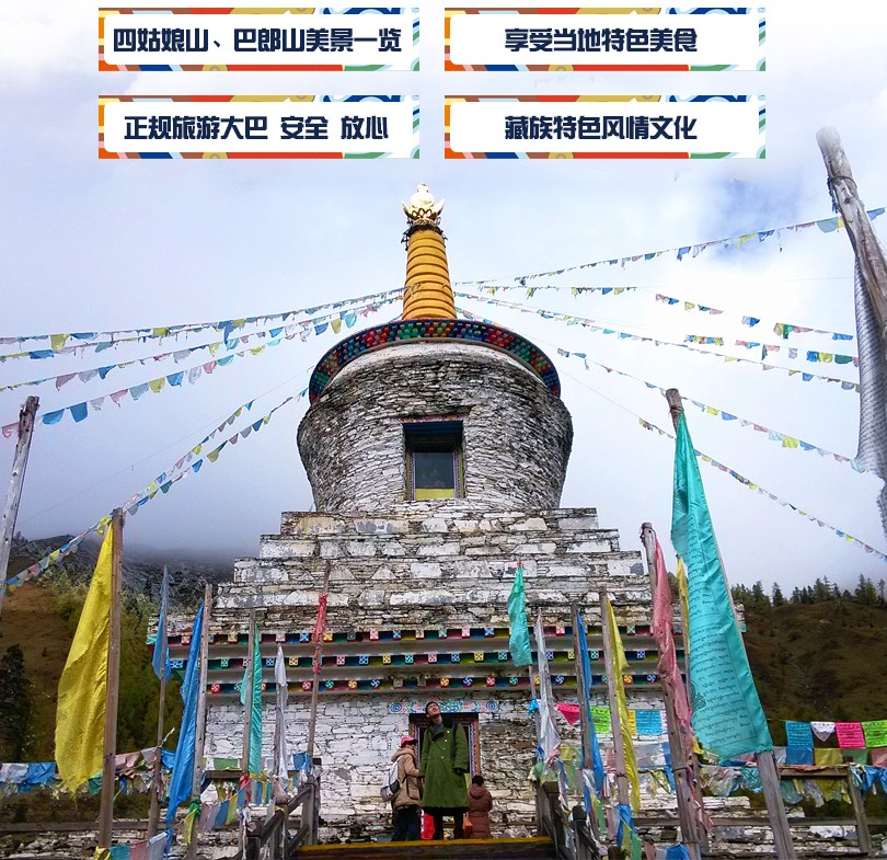 | 行程介绍 | 早上6:30——07:00在成都西二环路欧尚超市门口统一集合出发,沿岷江而上,沿途经都江堰、紫坪埔水利工程,沿都汶高速抵映秀,沿途感受2008年汶川大地震“地动山摇、山崩地裂、沧海桑田”后的景象,感悟大自然的力量;观看震后统一重建的具有民族特色的民居,感受人定胜天的伟力。而后从映秀出发经新修隧道,抵耿达乡后沿卧龙峡谷,欣赏峡谷小桥、流水、枯藤、老树的美丽风光,而后翻越巴郎山(垭口海拔4523米),可观云海、映山红、红白杜鹃花、松萝、高山草甸等;观看植物从常绿阔叶林到高山荒漠的垂直变化,感受“一山观四季、十里不同天”的气象变迁。中午抵达四姑娘山午餐后,导游根据具体时间安排游览双桥沟(观光车70元/人,必须自费),观阴阳谷、五色山、日月宝镜、人参果坪、沙棘林栈道、撵鱼坝、猎人峰、牛棚子、牛心山、阿妣山、野人峰等,双桥沟景区开阔平坦、景点集中,全程通车。沟内以山景为主,沿沟216平方公里范围内,次第分布着几十座海拔在5000米上的山峰,会同山涧溪流,如同徐徐展开的山水画廊。沟内还分布着目前国内罕见的千年原始沙棘树林,以及平坦宽阔的高山草甸,夏季,各色花卉装簇其间,香飘数里,漫步其中,宛若置身仙境。沟内现已开通绿色环保的观光车,游客可以更加舒适、方便的游览整个景区。(如第一天到达时间较晚,则改为第二天游览) 备注:双桥沟全程34公里;乘观光车游玩,一般游玩时间为4小时左右;景区内,每个景点都有一个观光车上下的车站,请在车站坐车,保管好自己的贵重物品及随身物品。 |