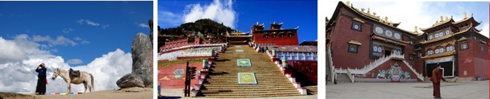 早餐后出发,经黑桥进入‘财神的坝子’——壤塘县境内;沿杜柯河逆流而上,‘圣佛天眼’—曾克寺、西穷寺、鱼托寺依次呈现在你的眼前,在蓝天、白云、高山、峡谷、河流、湖泊、草甸、森林、藏寨、经幡、白塔以及淳朴藏民的承托之下组成了一幅美轮美奂的画面——这里就是人们梦寐以求伊甸园!如痴如醉回味之中翻越德勒神山(海拔4517米)进入美丽的金马草原,远眺东嘎寺,抵达盛产黄金的地方——色达县城入住酒店休息。